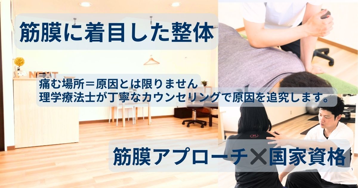 - 負担の軽減:筋膜がスムーズに動くよう整えることで、関節への負担を減らし、再発しにくい身体づくりを目指します 。
