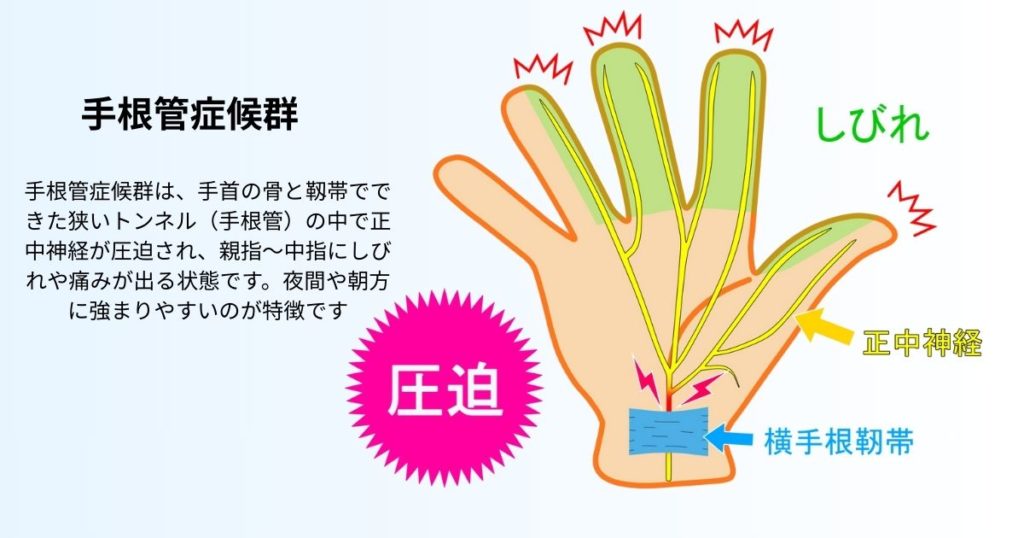 • しびれの範囲:特に親指から薬指の一部にかけて症状が出やすく、夜間や朝方に強まるのが特徴です。