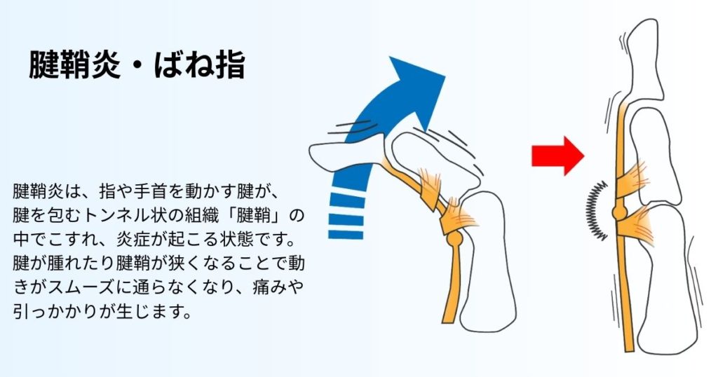 これらは、親指の腱鞘炎である「ドケルバン病」や、指の引っかかりが生じる「ばね指」などで多く見られます。