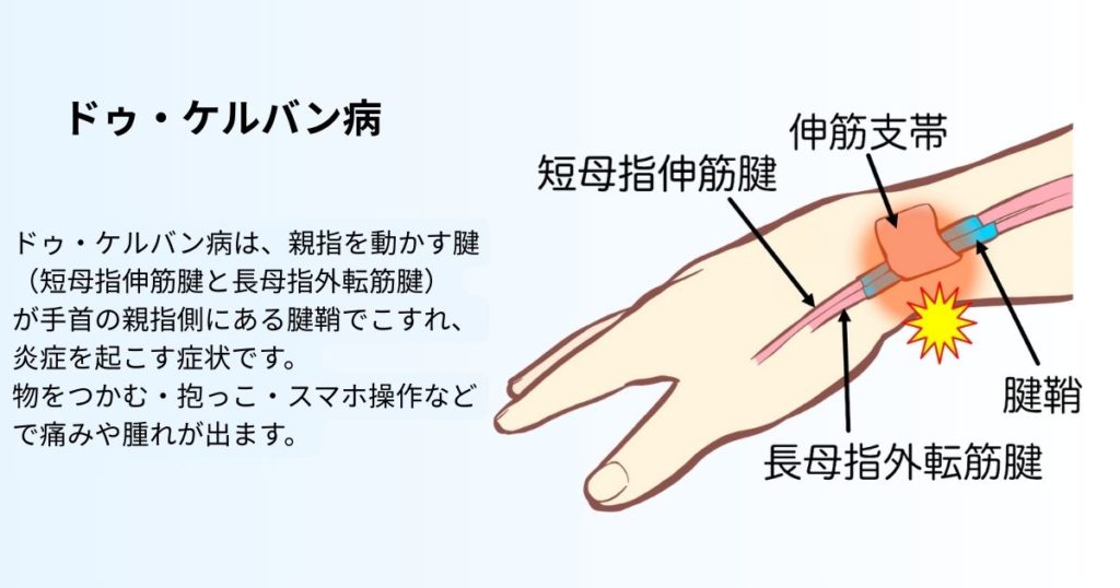 親指を動かす2つの腱(短母指伸筋腱と長母指外転筋腱)が、手首のトンネル(腱鞘)でこすれて炎症を起こします 。