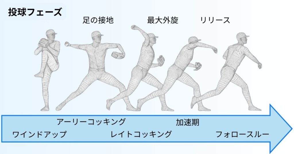 野球の投球動作では、動きがいくつかのフェーズ(局面)に分かれます。
